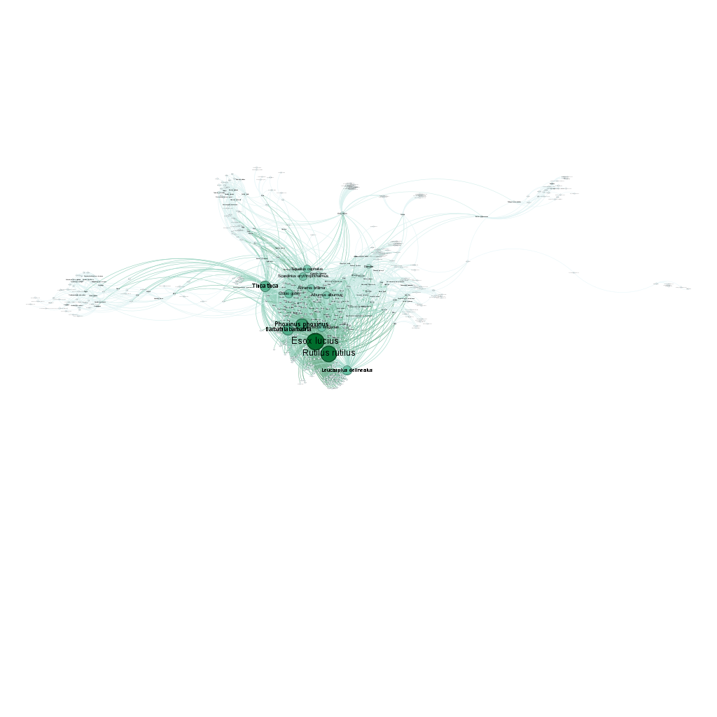 This creates a GDF file with nodes (sites and species) and edges (interactions) that can be opened in Gephi. The fish dataset contains 2703 site-species interactions across 338 sites and 195 species.